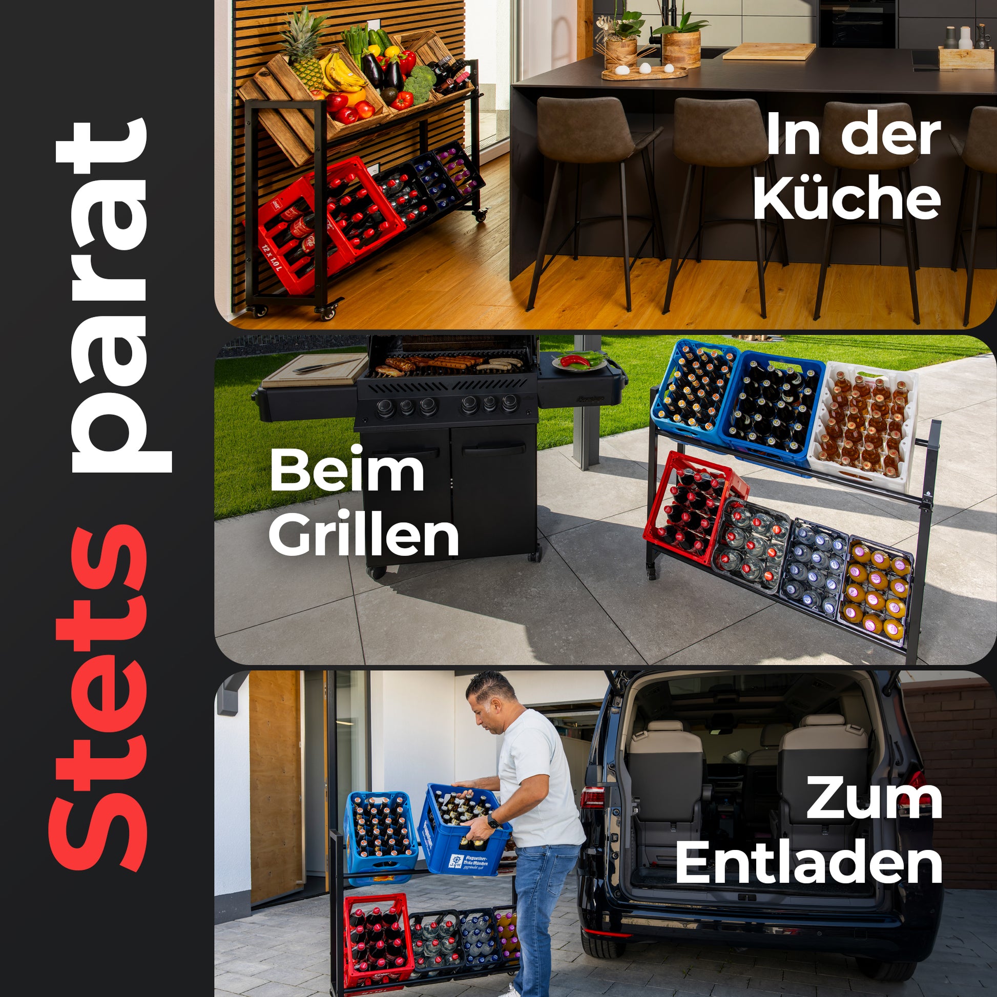 Perfekt geeignet für alle, die Ordnung, Funktionalität und Mobilität in einem durchdachten Getränkekistenregal suchen.